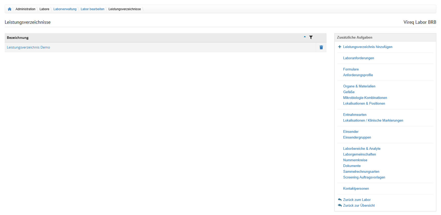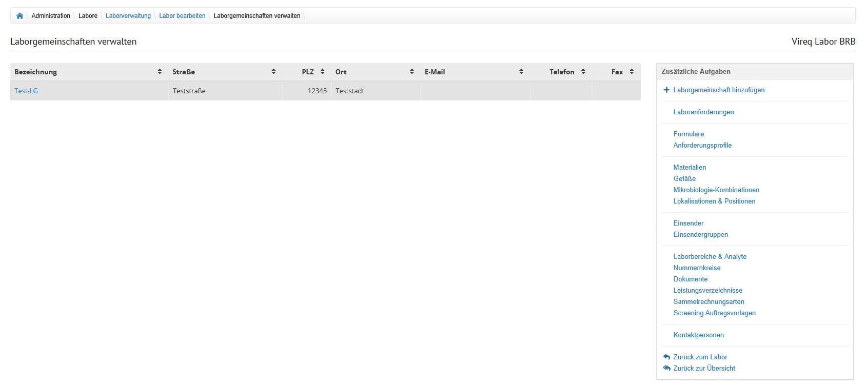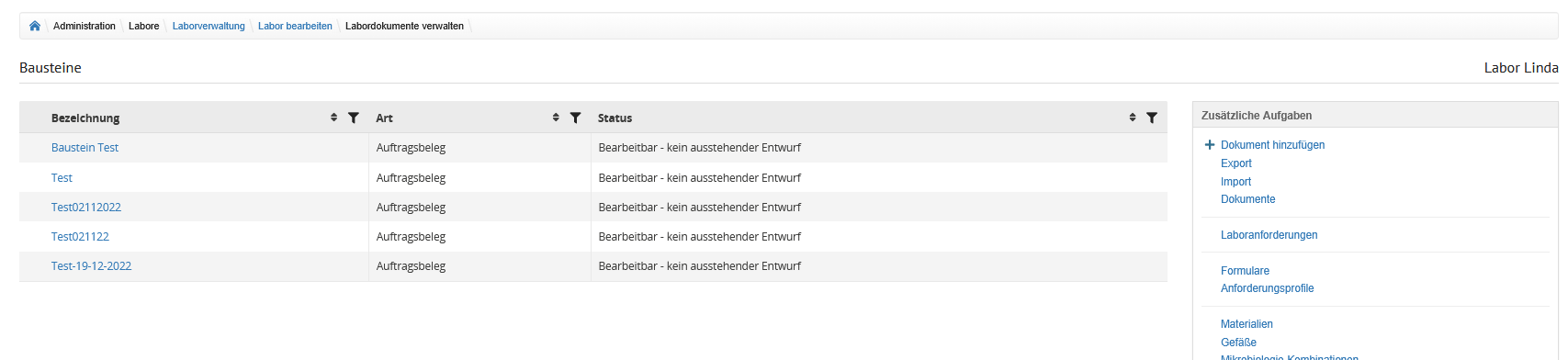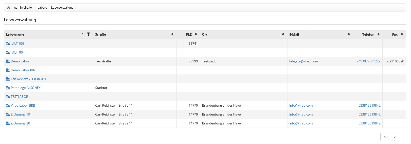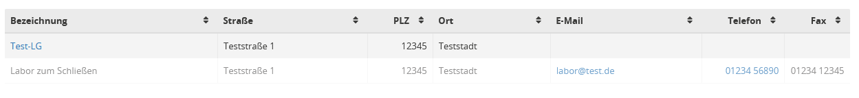 Auf der Übersicht der Laborverwaltung werden alle im System hinterlegten Labore angezeigt.