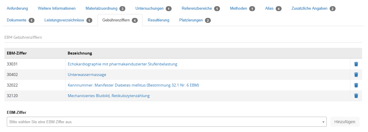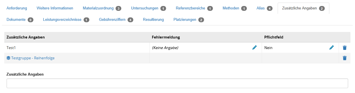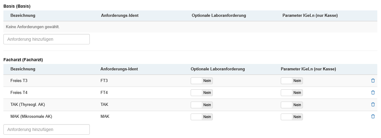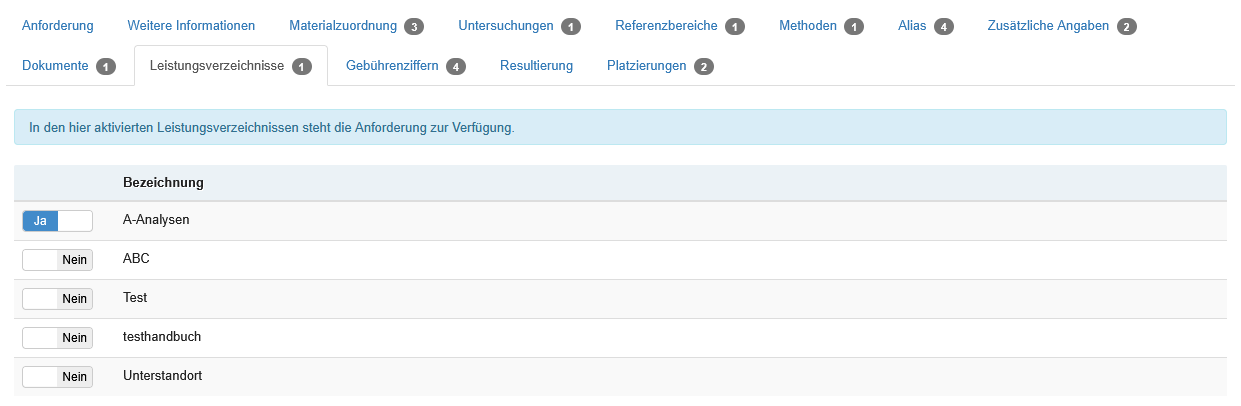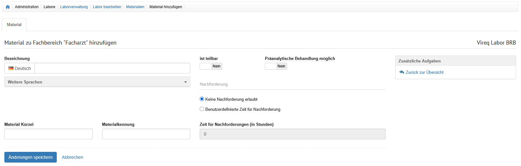| Nachforderung zulassen | Auswahlschalter | Wird der Auswahlschalter hier auf "Ja" gesetzt, dürfen Einsender grundlegend nachfordern. Weitere Einschränkungen aus den Laboreinstellungen und Einstellungen an Laboranforderungen und Material können die Nachforderung weitergehend beeinflussen. |