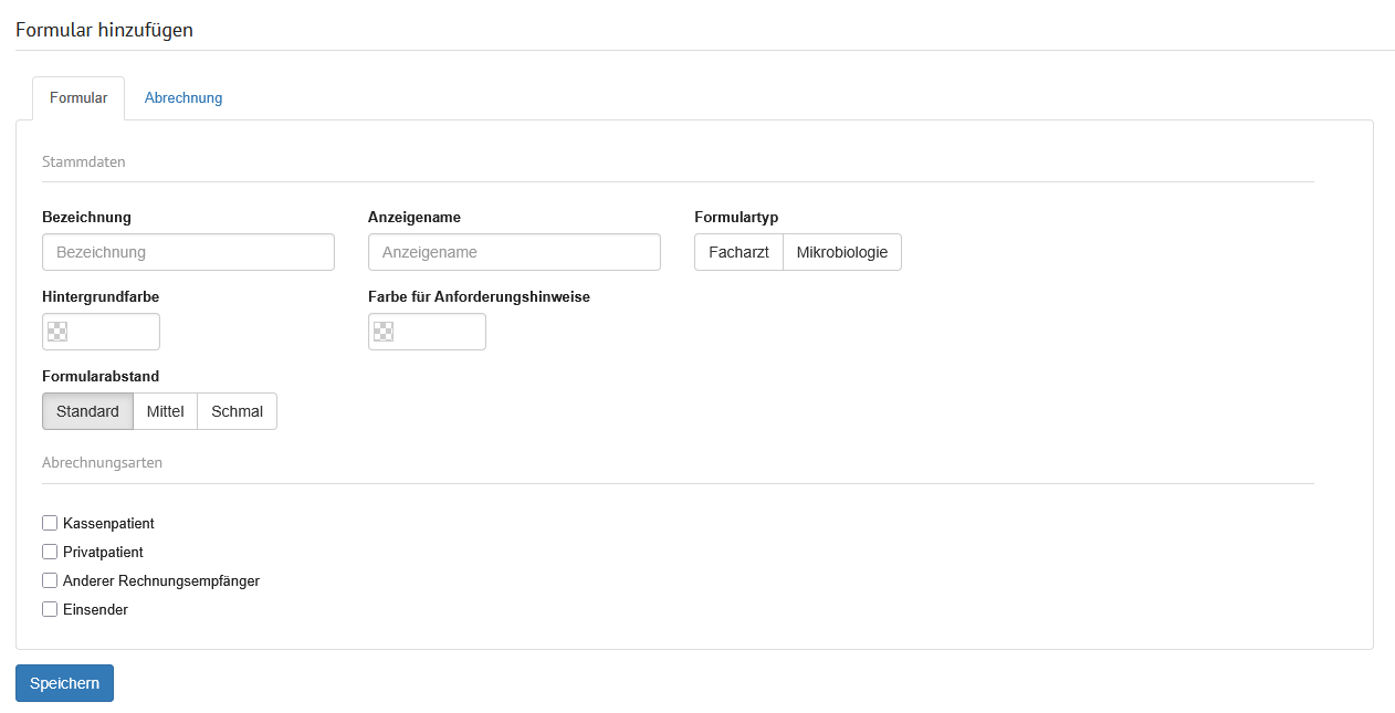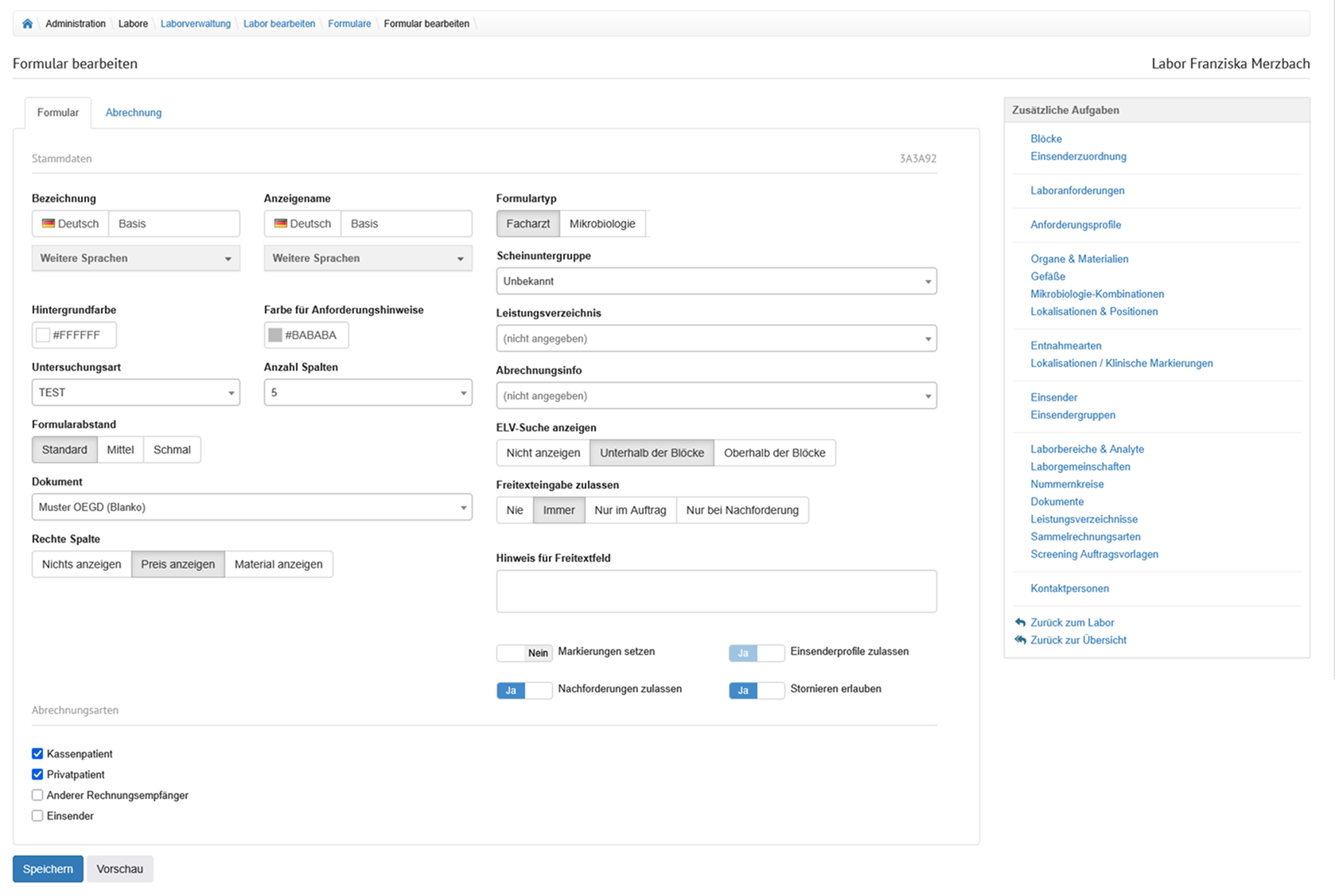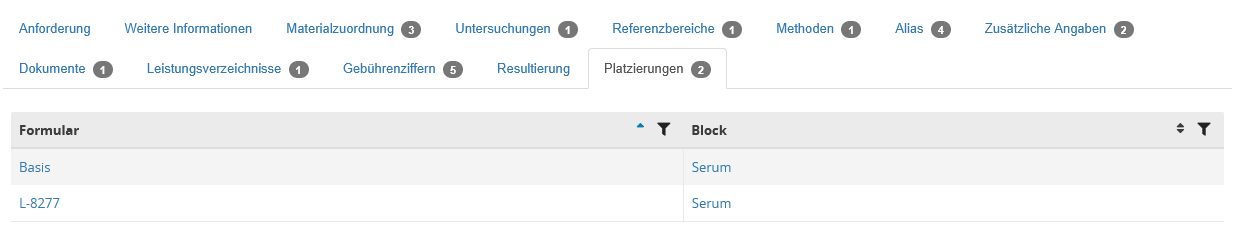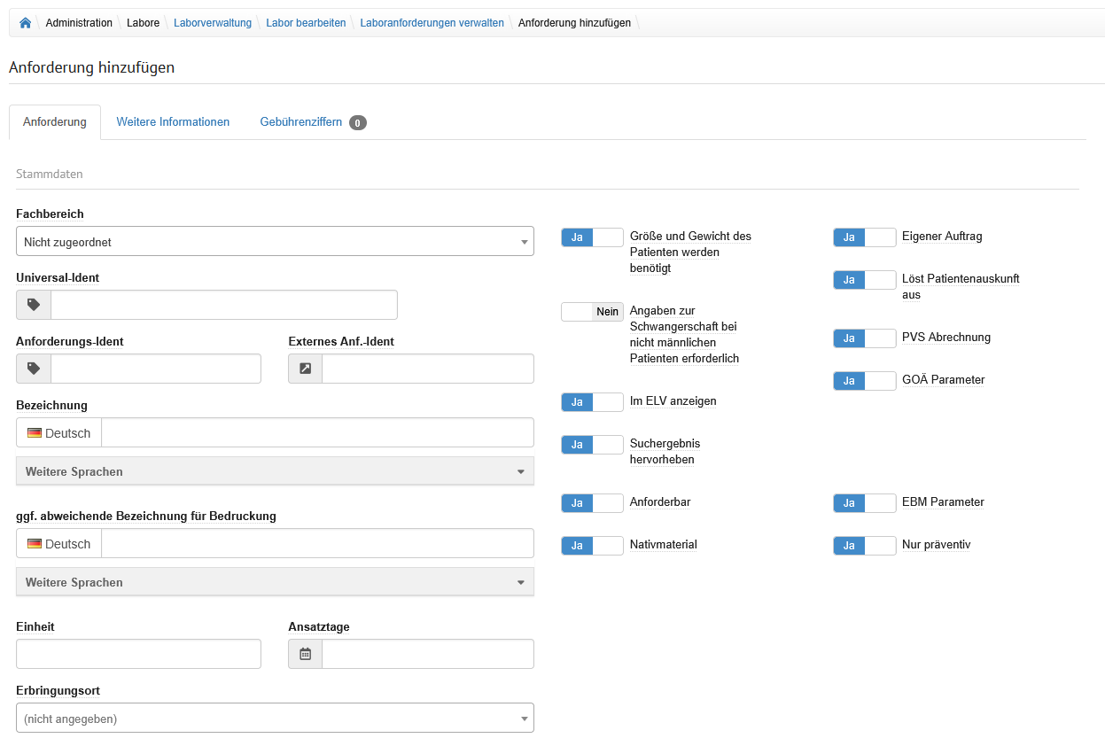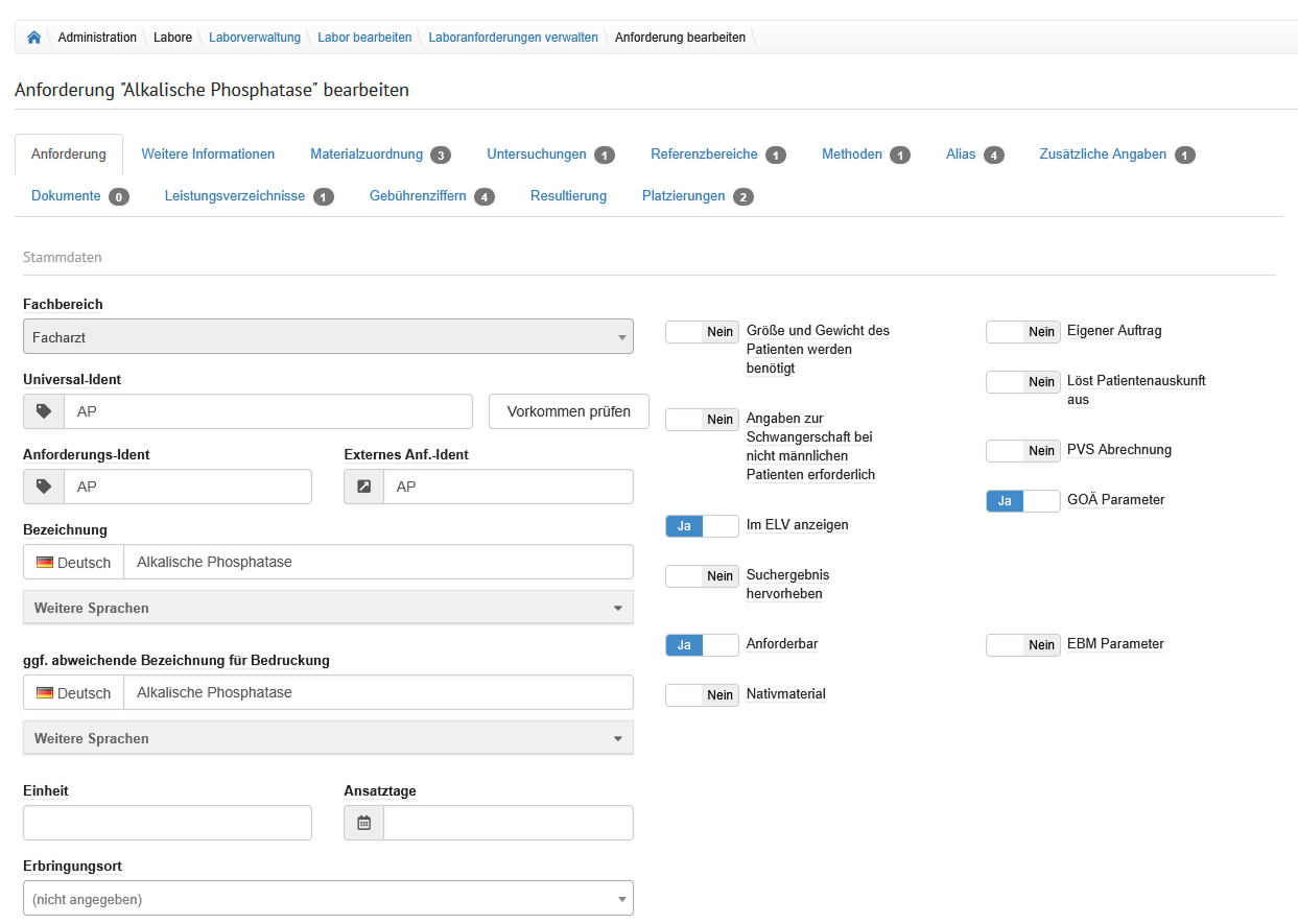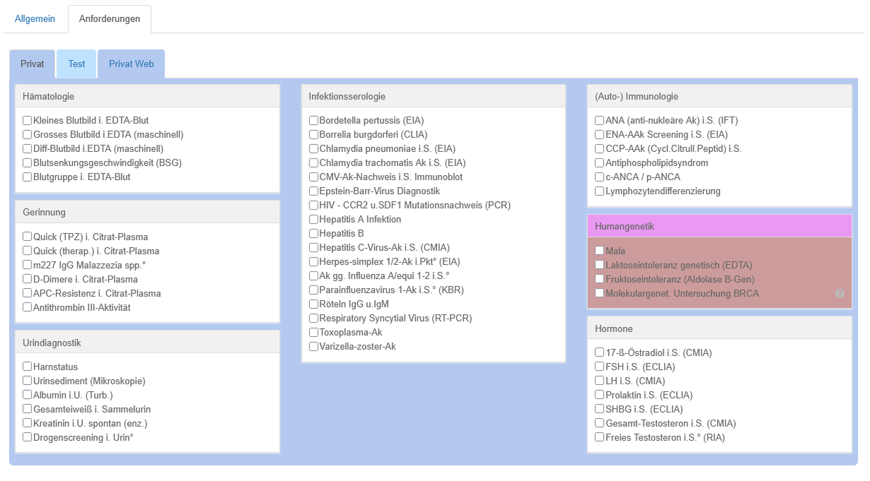 Der Bereich wird durch Tabreiter in die Formulare unterteilt, welche am Labor hinterlegt wurden.