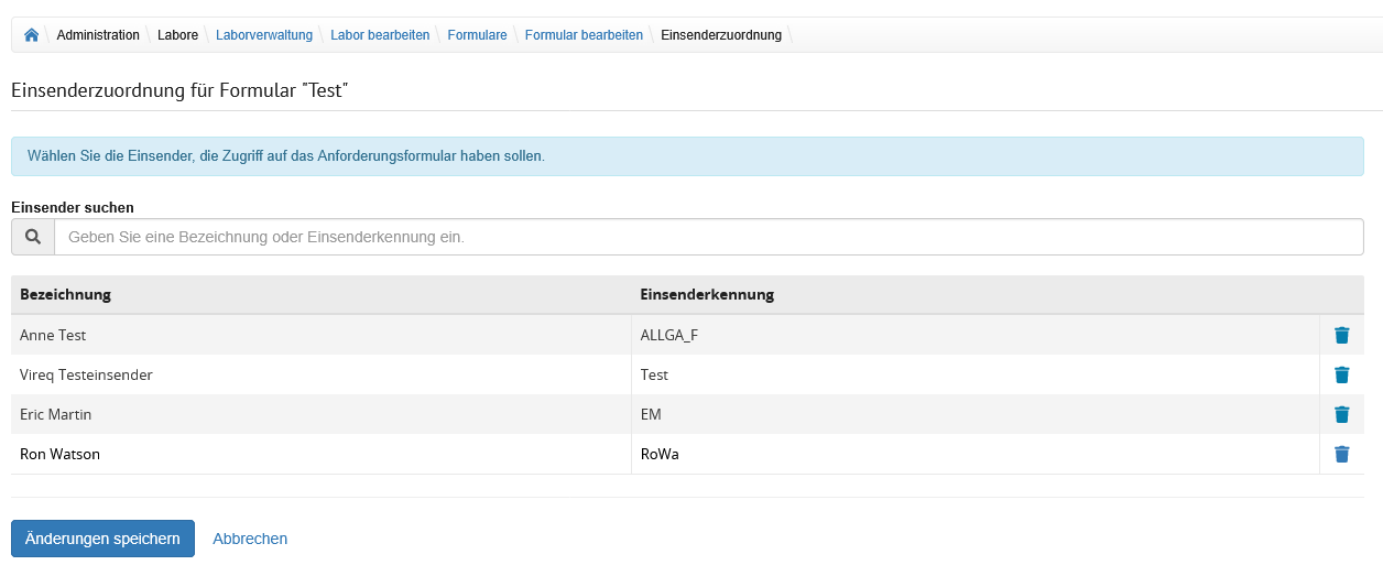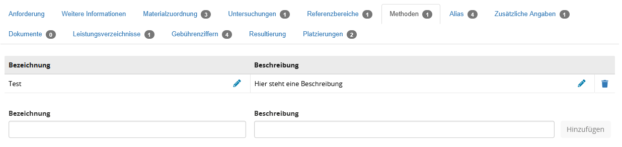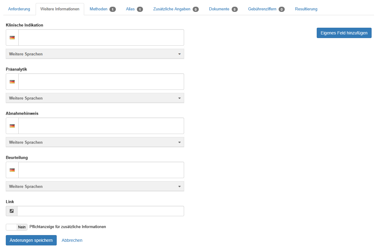 | Laborname | Eingabefeld | In diesem Feld stehe der Laborname. Dieser wird unter anderem zur Anzeige im Bereich "Meine Labore" verwendet. Der Laborname darf maximal 250 Zeichen enthalten. |
