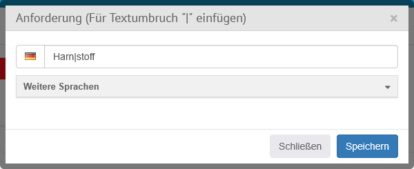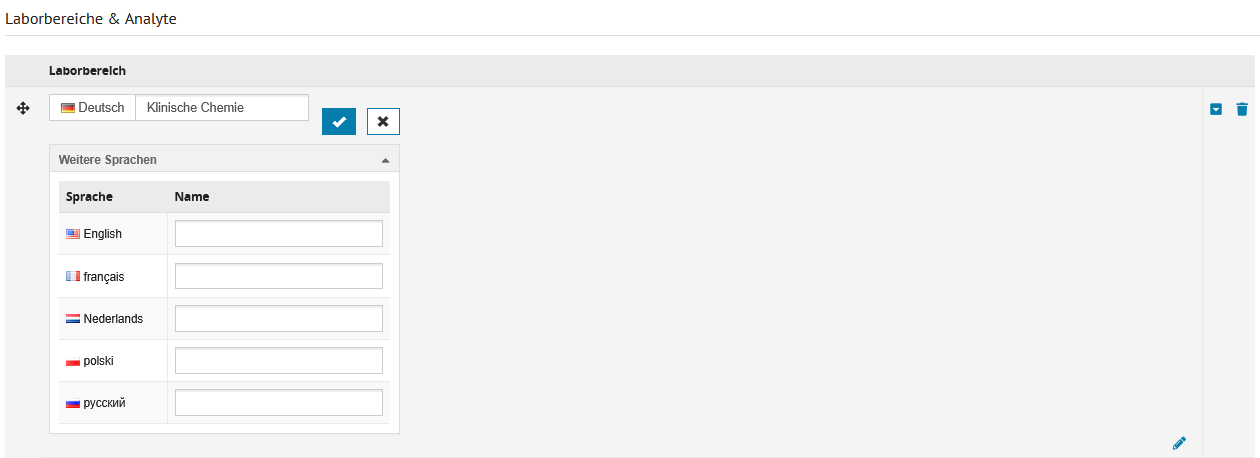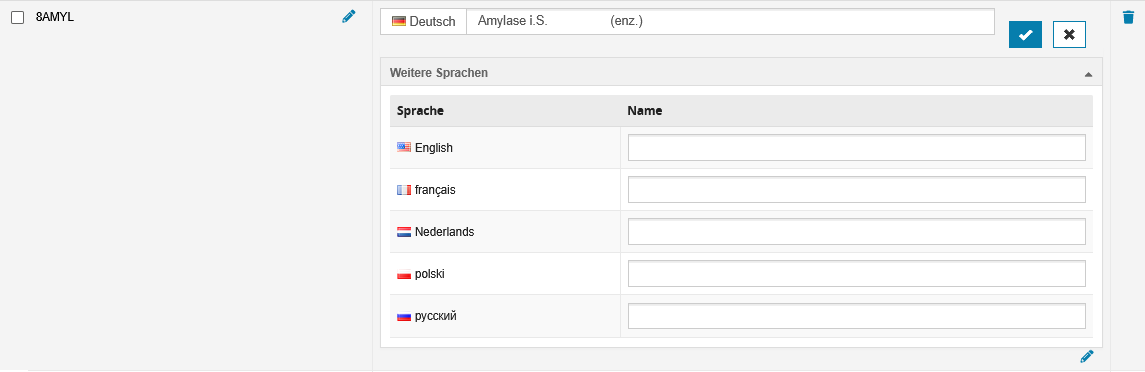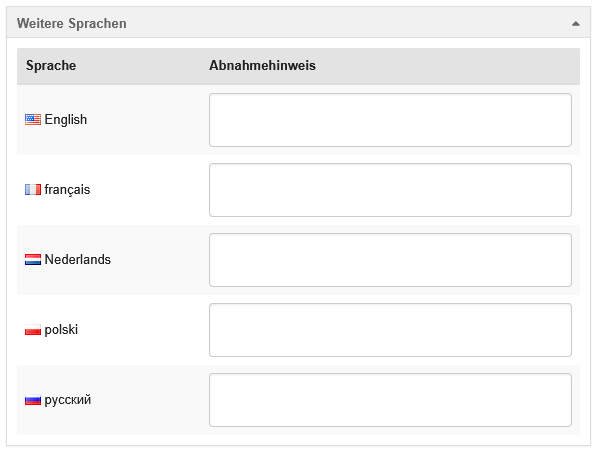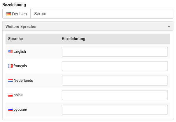 Es können im Klappbereich "Weitere Sprachen" Übersetzungen in weiteren Sprachen gepflegt werden.