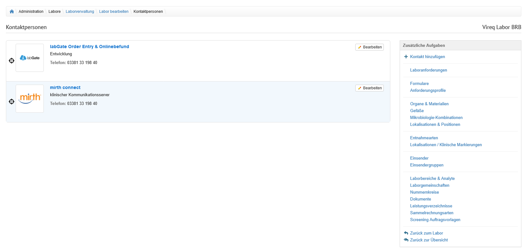 Auf der Seite "Kontaktpersonen" wird eine Liste der hinterlegten Kontaktpersonen des Labors angezeigt. Jeder Kontakt ist in einer seperaten Box dargestellt.