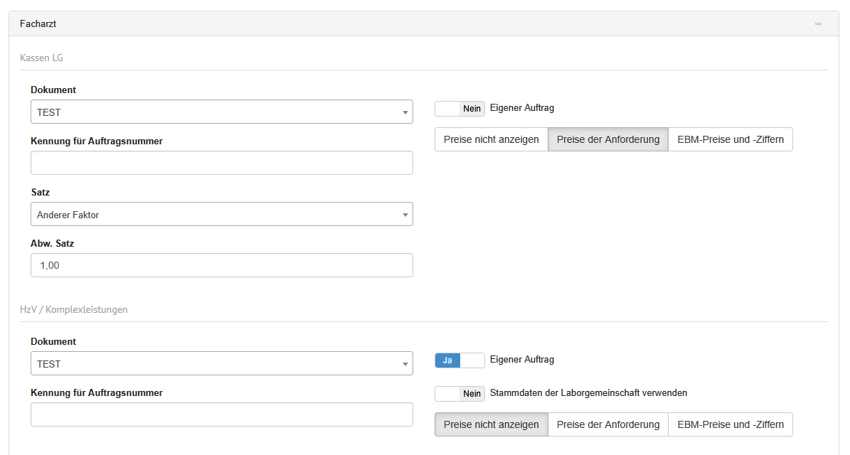 | Stammdaten der Laborgemeinschaft verwenden | Auswahlschalter | Wird der Auswahlschalter hier auf "Ja" gesetzt, so werden die Stammdaten der mit dem Einsender verbundenen Laborgemeinschaft, welche für Anforderungen hinterlegt wurden, im Auftrag verwendet.Vorraussetzung hierfür sind folgende Einstellungen: