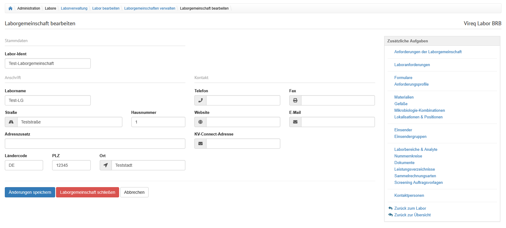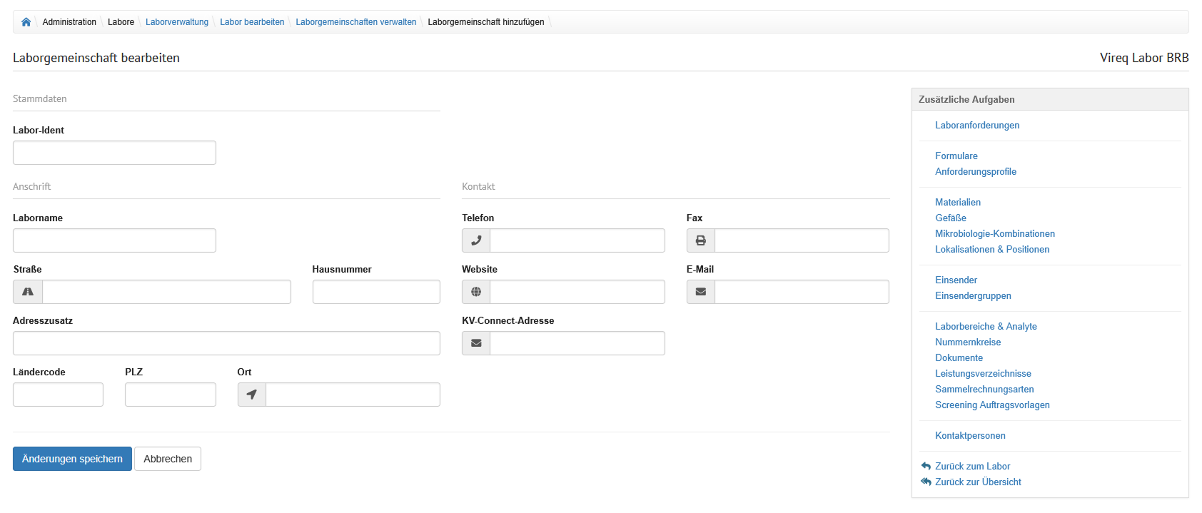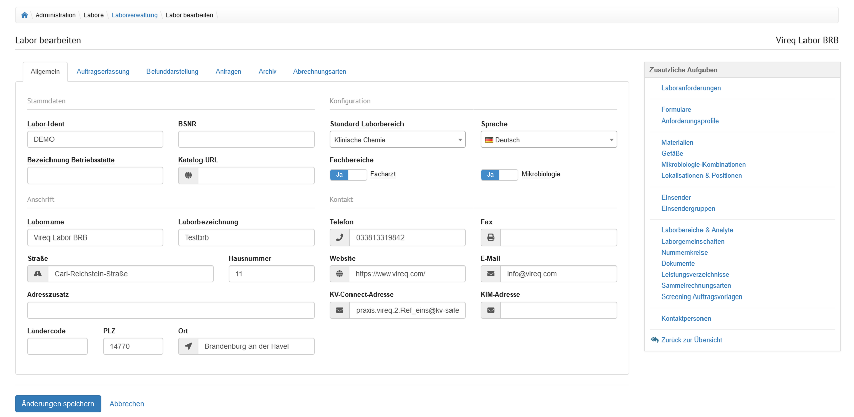 Im Bereich "Labor bearbeiten" können angegebene Informationen für ein Labor eingesehen und angepasst werden. Dabei werden die verschiedenen Thememgebiete in Tabreiter unterteilt. Alle Änderungen können mit Klick auf den Button "Änderungen speichern" gespeichert werden. Ein Klick auf "Abbrechen" verwirft die Änderungen und navigiert zurück auf die Übersicht.