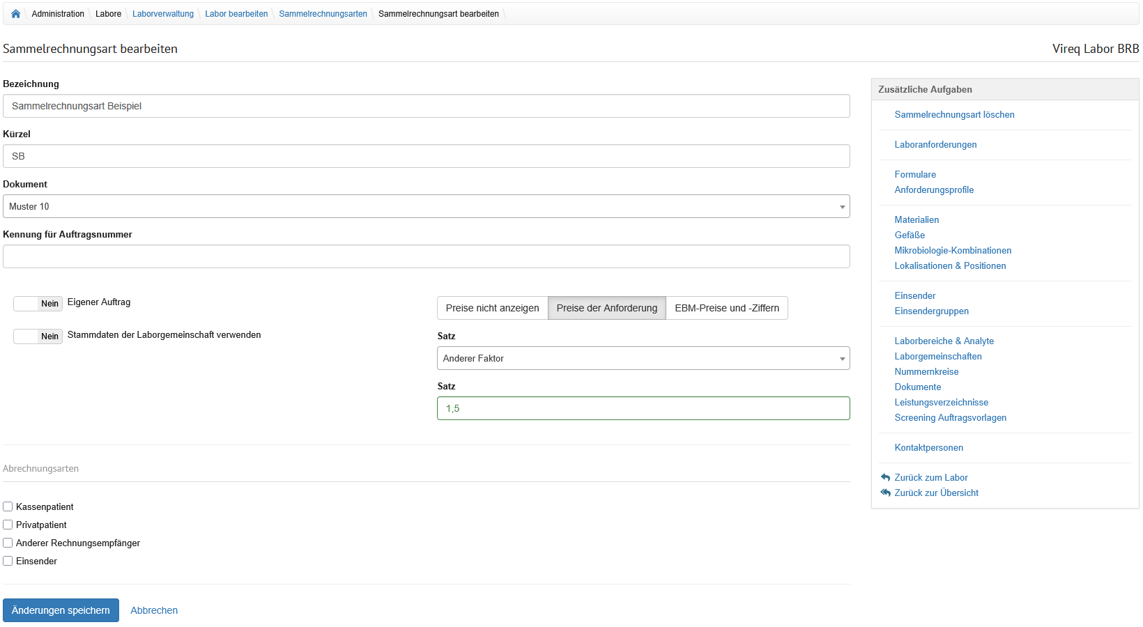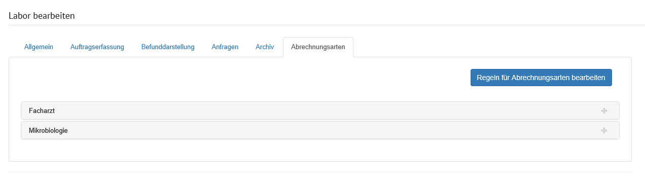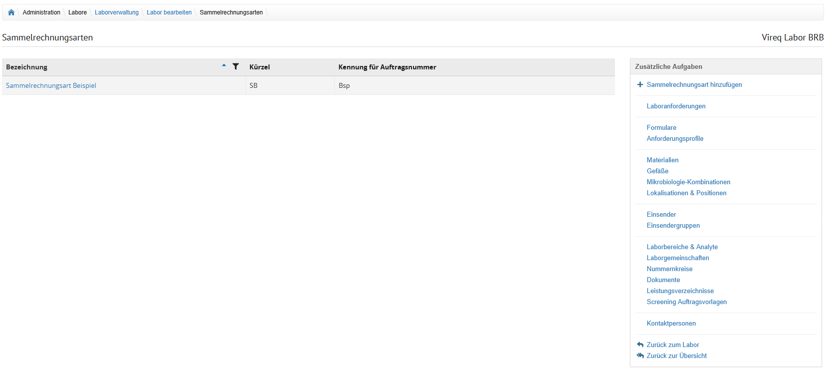 Auf der Seite "Sammelrechnungsarten" werden in einer Tabelle die für das Labor angelegten Sammelrechnungsarten angezeigt.