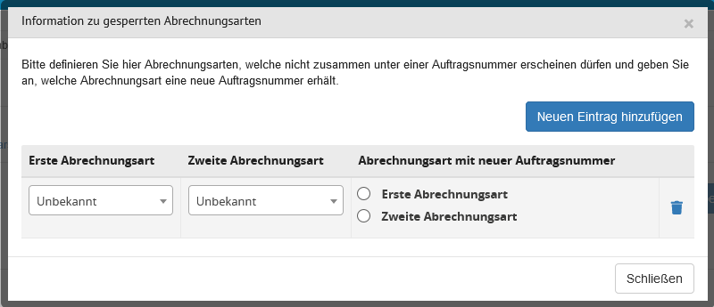 In der Tabelle Pflichtfelder kann festgelegt werden, welche Felder für welche Abrechnungsart ein Pflichtfeld innerhalb der Auftragsanlage sind.