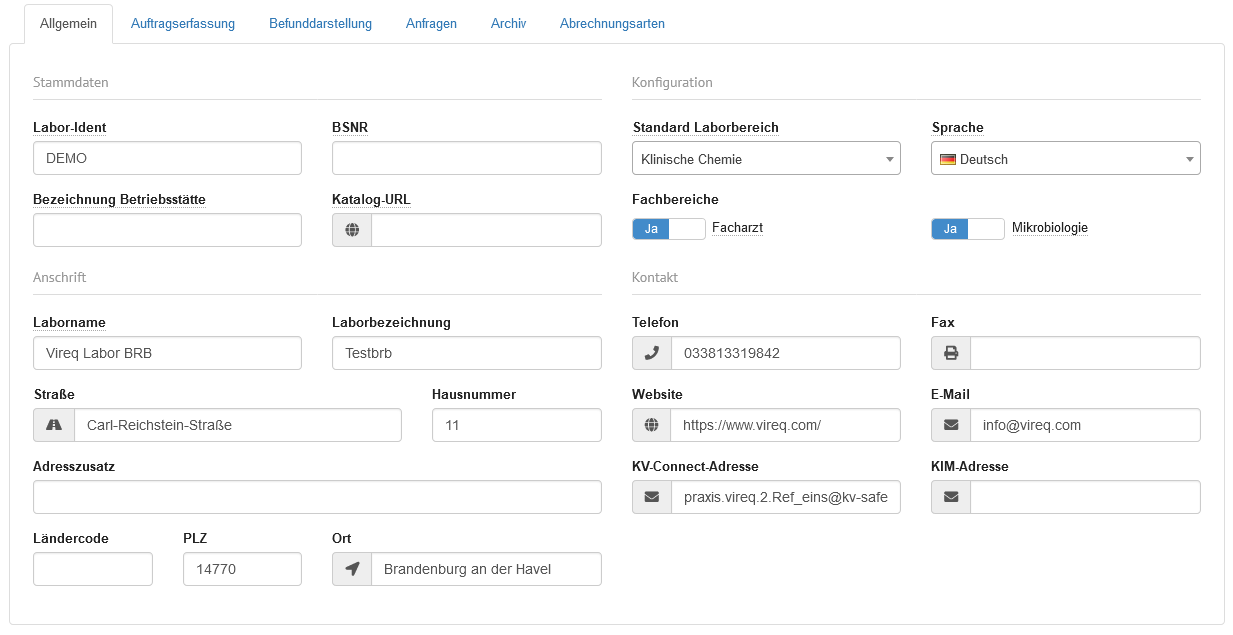 | Website | Eingabefeld | In diesem Feld wird die URL zur Website des Labors angegeben. |