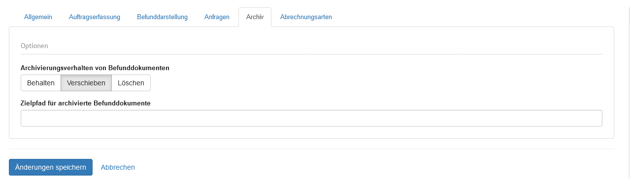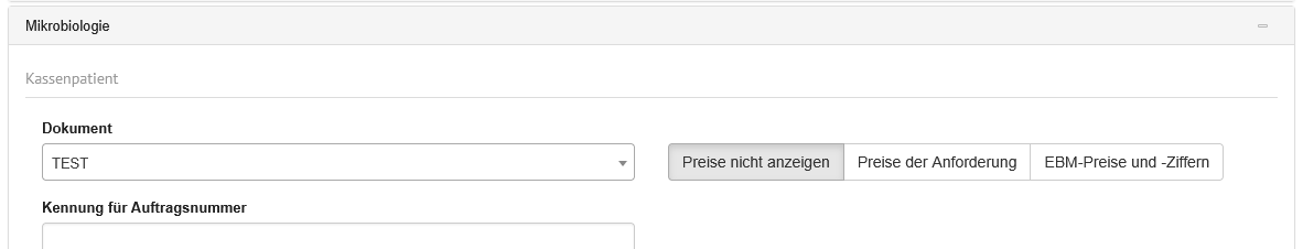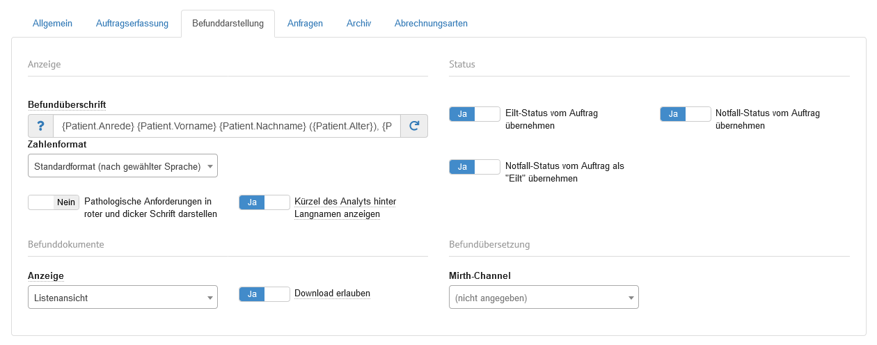 | Reine Freitextaufträge zulassen | Auswahlschalter | Wird der Auswahlschalter hier auf "Ja" gesetzt, können Aufträge nur durch Freitexteingabe und ohne Auswahl von Laboranforderungen abgeschlossen werden. |