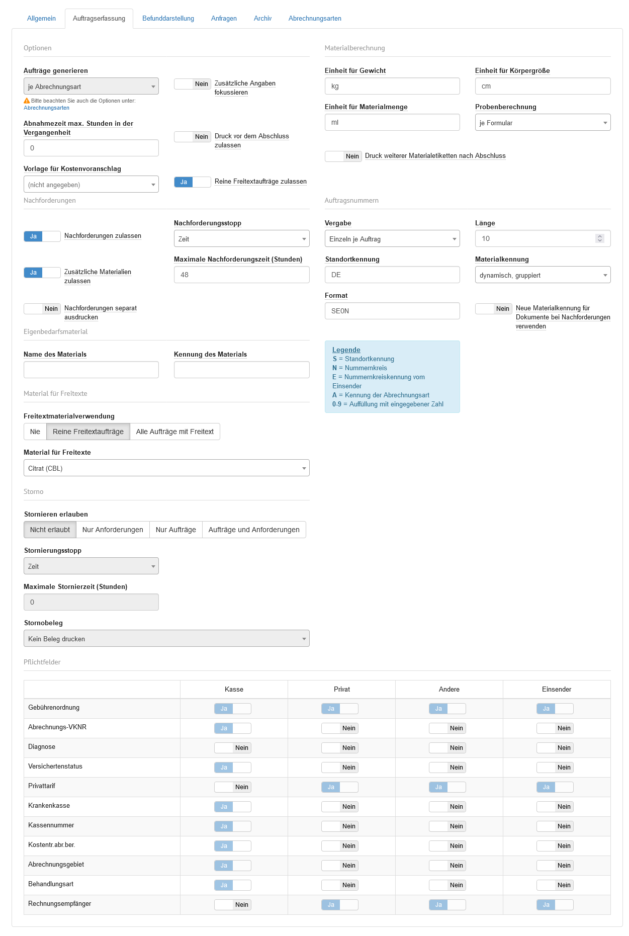 Im Tabreiter "Auftragserfassung" werden alle Informationen und Einstellungen, welche für die an das Labor gesendeten Aufträge benötigt werden, hinterlegt.
