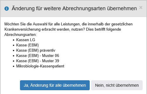 | Abrechnungsarten | Checkboxen | Im Bereich "Abrechnungsarten" kann mit Checkboxen ausgewählt werden, für welche Abrechnungsarten die Sammelrechnungsart gelten soll.Dabei gibt es folgende Optionen: