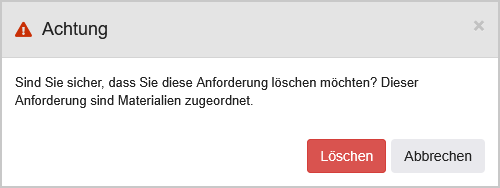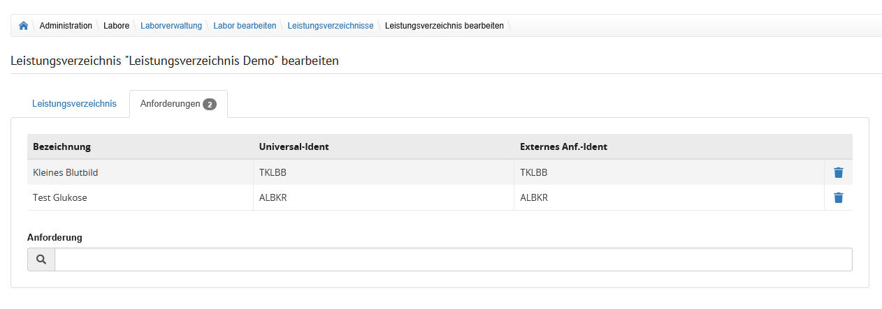 | Aktionsspalte | Hier kann mit Klick auf das Müllerimer-Icon die Zeile und somit die Zuordnung der Anforderung zum Leistungsverzeichnis gelöscht werden. |