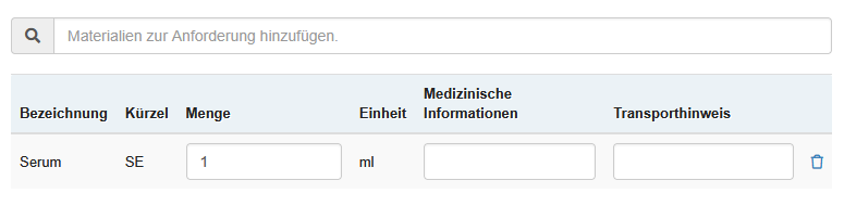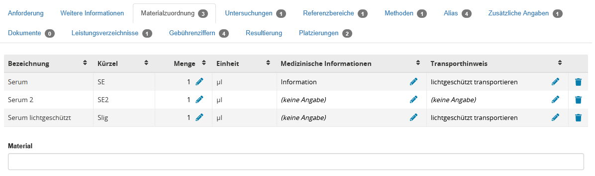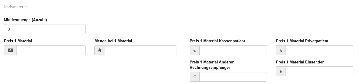 | Names des Materials | Eingabefeld | In diesem Feld wird die Bezeichnung für Eigenbedarfsmaterial (Material, das beim Einsender bleibt, dementsprechend nicht ins Labor geht) festgelegt. |