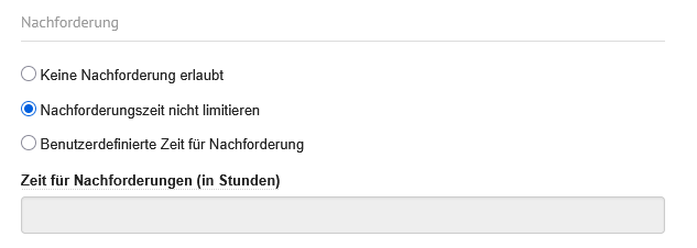 | Nachforderungsstopp | Dropdown | In dem Dropdown wird entschieden, wie lang eine Nachforderung möglich sein soll. Es gibt dazu folgende Optionen: