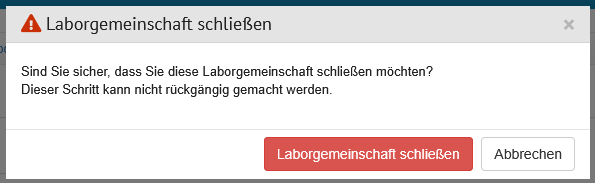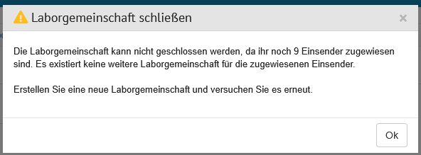 Das Schließen einer LG ist nicht möglich, wenn ihr Einsender ohne weitere Laborgemeinschaft zugewiesen sind.