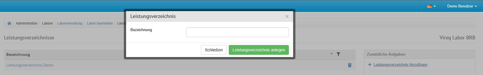 Mit Klick auf den Menülink "Leistungsverzeichnis hinzufügen" öffnet sich das "Leistungsverzeichnis" Modal. Nach Eingabe einer Bezeichnung wird das neue Leistungsverzeichnis mit Klick auf den Button "Leistungsverzeichnis anlegen" erstellt. Eine neue Zeile in der Übersichtstabelle erscheint.
