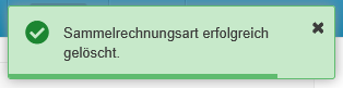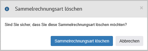| Sammelrechnungsart löschen | Aktionslink | Bei Klick auf den Aktionslink öffnet sich ein Modal. In diesem muss die Löschung bestätigt werden. Nach erfolgreicher Löschung wird eine Meldung ausgegeben und zurück auf die Übersicht navigiert.![]() |