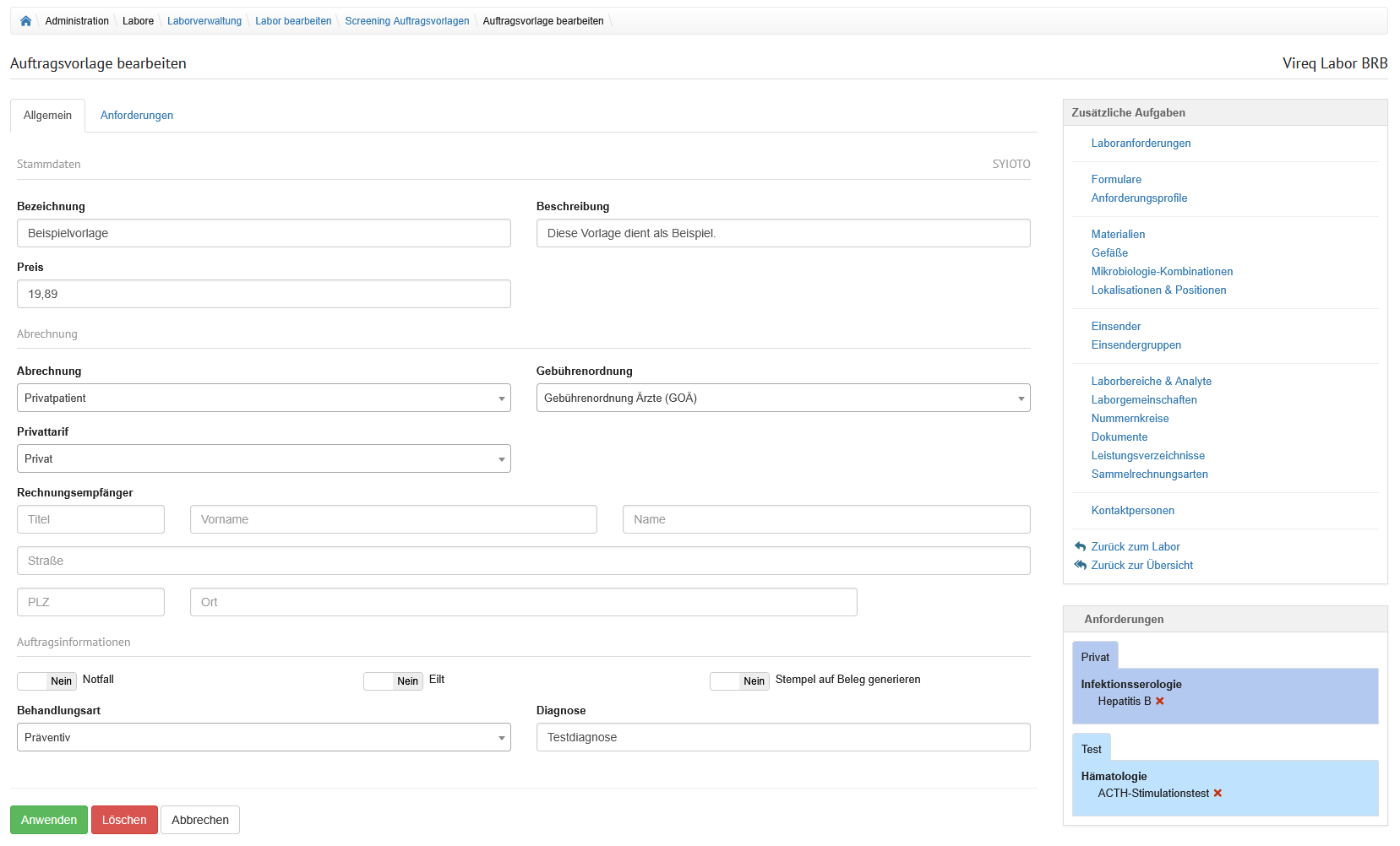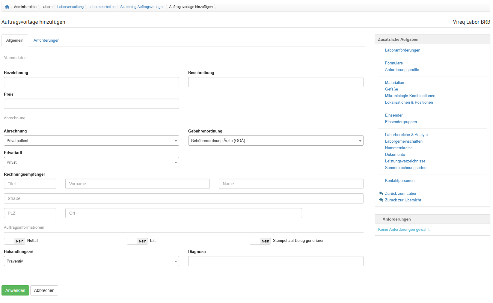 | Anwenden | Bei Klick auf diesen Button werden die Änderungen der Auftragsvorlage gespeichert. Das System navigiert zur Übersicht aller Screening Auftragsvorlagen des Labors. |