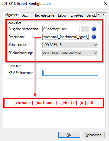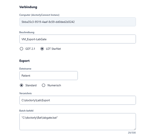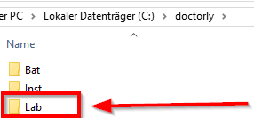 Wird seitens Doctorly ein Update ausgerollt, welches die Übernahme der BSNR beinhaltet, muss das Verzeichnis auf „C:\doctorly\Lab\“ geändert. Ebenso wird im Bereich „Batch-befehl“ der Hinweis „do nothing“ hinterlegt.