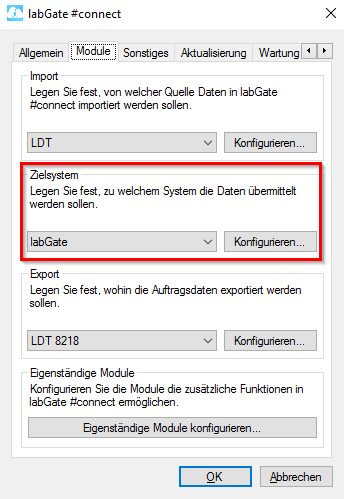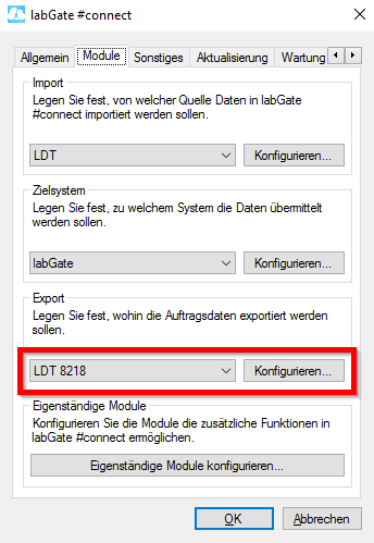 Öffnen Sie hierzu die Einstellungen, wechseln Sie zum Reiter "Module" und wählen Sie im Bereich "Export" die Option "LDT 8218". Anschließend klicken Sie "Konfigurieren".