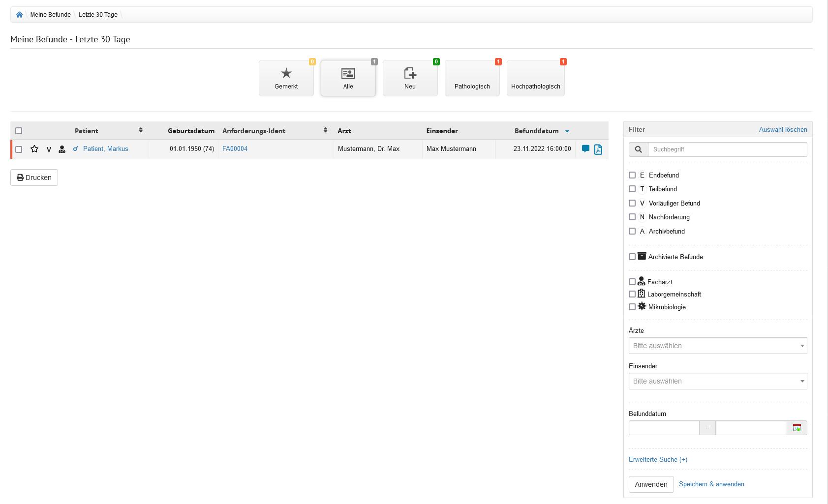 - "Letzte 30 Tage" - es werden alle in den letzten 30 Tagen eingegangenen Befunde angezeigt